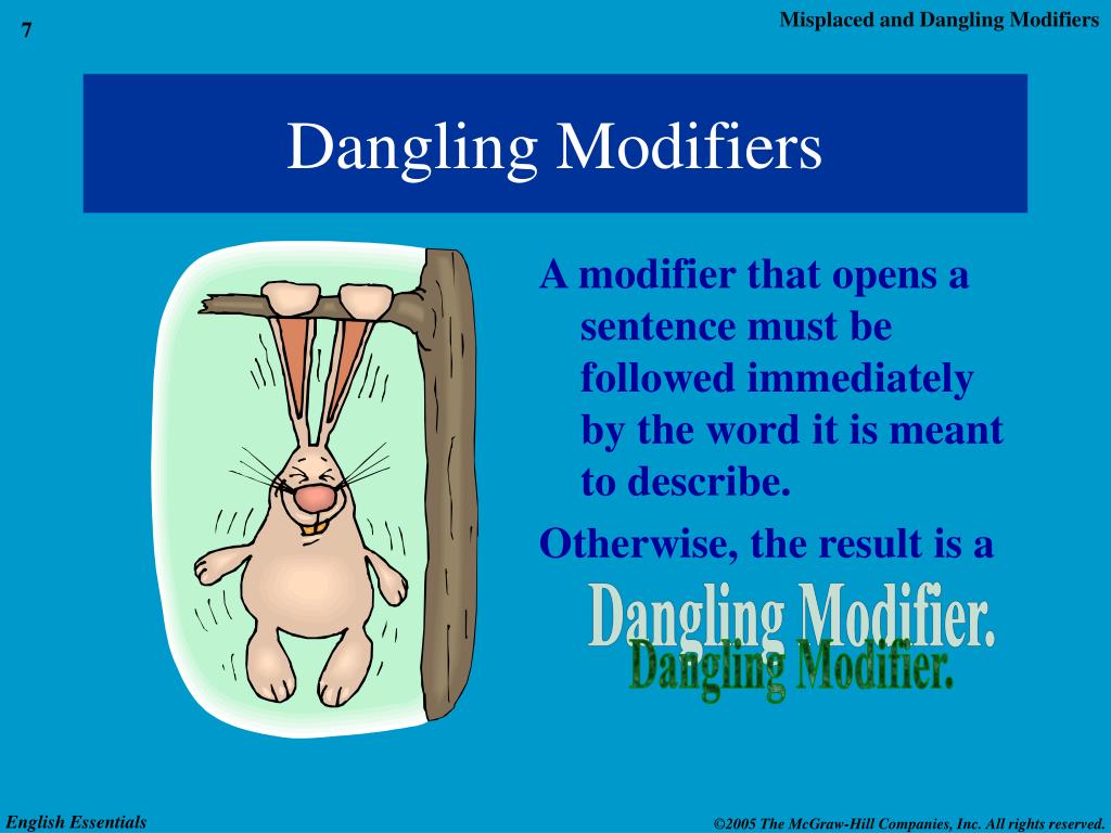 A dangling modifier is a word or phrase that modifies a word not clearly stated in the sentence. A commonly misplaced modifier is an adverb.because adverbs modify both verbs and adjectives, these misplaced modifiers often sound correct — but they're not.check out these examples of misplaced adverbs and see how a quick wording change can clear them up (the modifiers are underlined, and their nouns are in … A modifier describes, clarifies, or gives more detail about a concept. Chris berry, karl stolley last edited: Dangling modifiers and how to correct them.